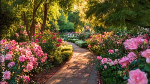 Fototapeta premium A winding pathway in a rose garden is surrounded by vibrant blooms during the golden hour. The soft sunlight filters through the trees, illuminating the colorful flowers.