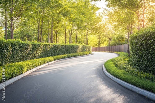 © setiyo, Obraz premium A winding paved road lined with green hedges and trees