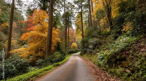 © borispain69, Obraz premium A winding paved road through a dense autumn forest
