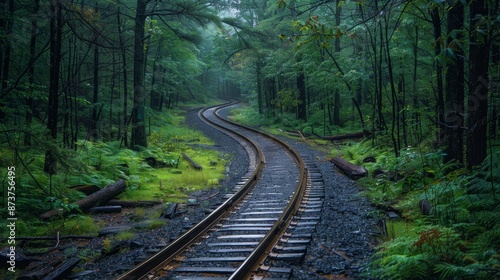 Fototapeta premium A winding railway track disappears into a lush, green forest. The air is misty, creating a sense of mystery and solitude.