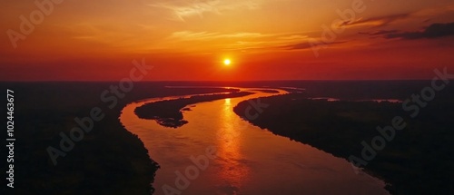 © harkamat, Naklejka premium A winding river cuts through a forest, reflecting the fiery suns