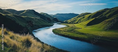 © hidayati, Fototapeta premium A winding river flows between green rolling hills and mountains