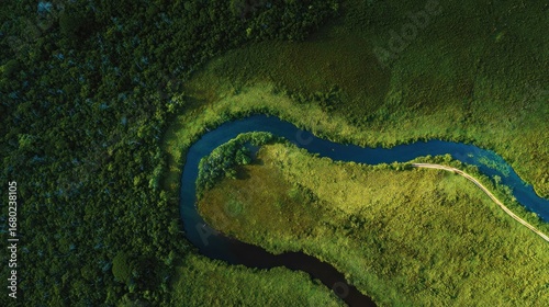 Fototapeta premium A winding river flows through a vibrant green landscape, creating a...