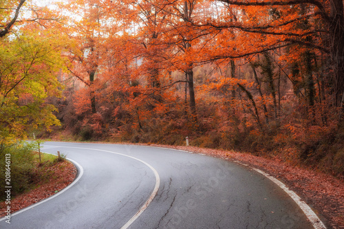 © Nickolay Khoroshkov, Obraz premium A winding road curves through autumn trees in New England