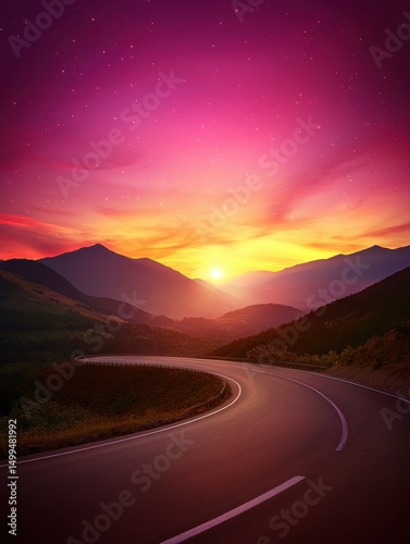 © Wanruedee, Fototapeta premium A winding road curves through mountains at sunset beneath a vibrant, colorful sky filled with stars.