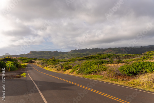 © porqueno, Fototapeta premium A winding road cuts through a lush, green landscape under a cloudy sky.