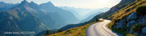 Fototapeta premium A winding road disappears into the distance up the side of a mountain, alpine...