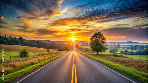 Fototapeta premium A winding road leading towards the horizon, bathed in the golden glow of a vibrant sunrise, with rolling hills and lush meadows stretching as far as the eye can see.