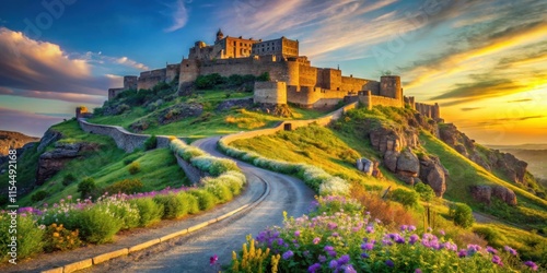 © GiftedFrames, Naklejka premium A winding road leads to a fortified castle perched atop a grassy hill, illuminated by the golden hues of a vibrant sunset.