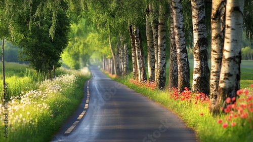 © Rstm, Obraz premium A winding road lined with birch trees.
