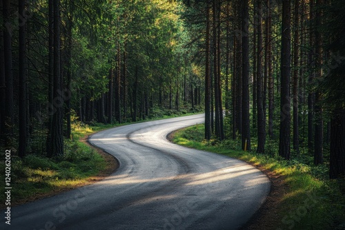 Fototapeta premium A winding road meanders through a serene forest, surrounded by lush greenery...