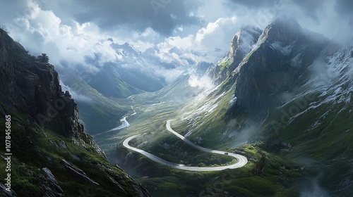© siyons, Naklejka premium A winding road snakes through a valley surrounded by majestic mountains and clouds.