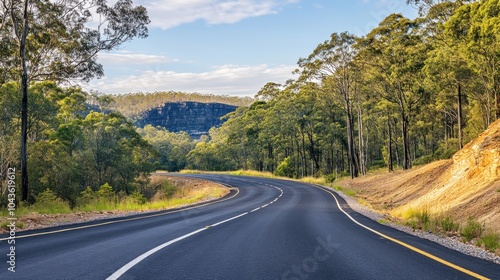 © Iswanto, Fototapeta premium A winding road surrounded by lush greenery and hills under a clear sky.