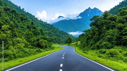 © Leninya, Fototapeta premium A winding road surrounded by lush greenery and mountains under a bright sky creates a serene landscape.