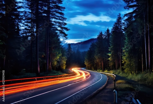 Fototapeta premium A winding road that travels through a dense forest during the night