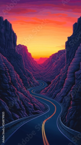 © NpicArt, Fototapeta premium A winding road through a canyon at sunset provides adventure