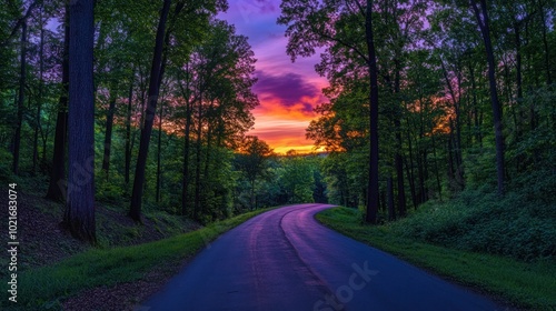© logyartstudios, Fototapeta premium A winding road through a forest with a beautiful sunset in the background.