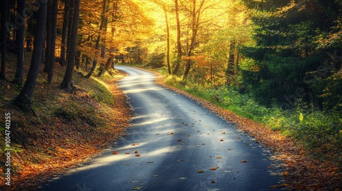 Obraz premium A winding road through a lush autumn forest, bathed in golden sunlight, with...