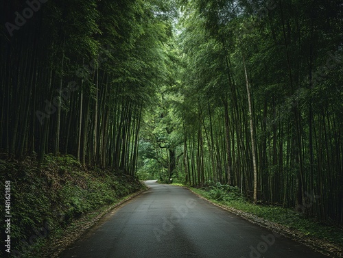 © Jennifer, Obraz premium A winding road through a lush bamboo forest.