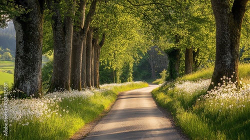 © Rstm, Naklejka premium A winding road through a lush green forest with tall trees on both sides.