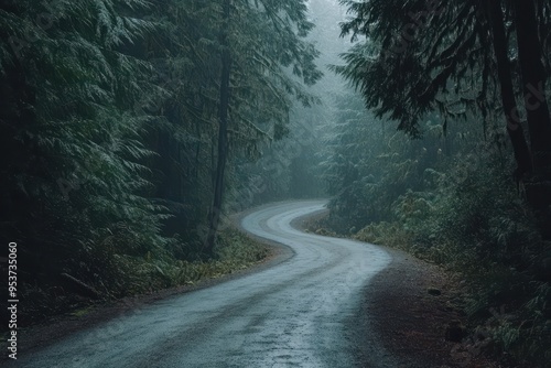 Naklejka premium A winding road through a misty forest, surrounded by lush greenery.