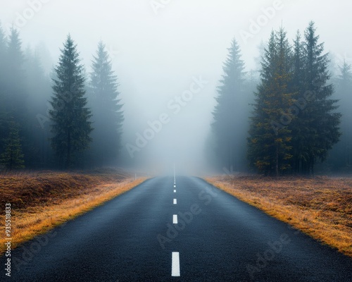 © kokoson6, Fototapeta premium A winding road through a misty forest with tall pine trees lining the path.