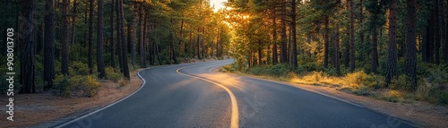 © nutcha, Obraz premium A winding road through a serene forest, illuminated by the golden light of sunset, inviting exploration and adventure.