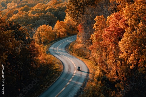 Naklejka premium A winding road through a vibrant autumn forest, showcasing a lone motorcyclist enjoying the scenic landscape.