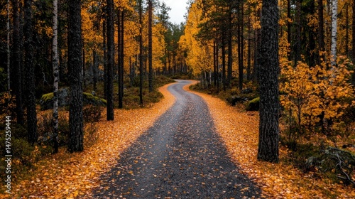 © pupus, Obraz premium A winding road through a vibrant forest during the autumn season
