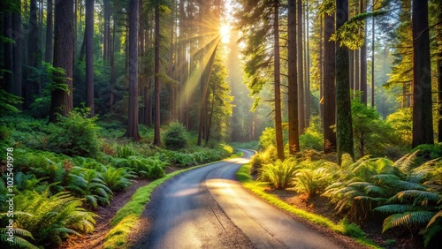 Fototapeta premium A winding road through a vibrant forest, sunlight filtering through the...
