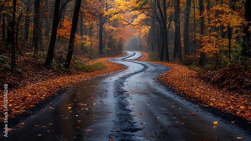 © Purnomo adi, Obraz premium A winding road through an autumn forest, with fallen leaves scattered on the wet pavement. The trees are a mix of orange, yellow, and red.