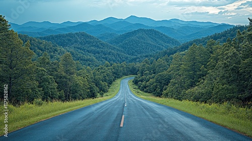 © aritha, Fototapeta premium A winding road through lush green mountains under a cloudy sky.