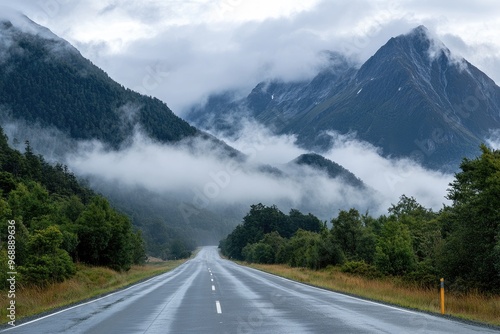 Fototapeta premium A winding road through misty mountains, surrounded by lush green forests and dramatic peaks, inviting adventure and exploration.