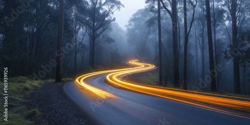 Naklejka premium A winding road through the fog with glowing light trails hints at mystery and...