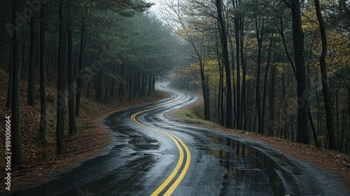 Fototapeta premium A winding road through the forest during a rainstorm, with trees on both...