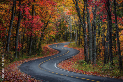 Fototapeta premium A winding road through vibrant autumn foliage, showcasing the beauty of fall...