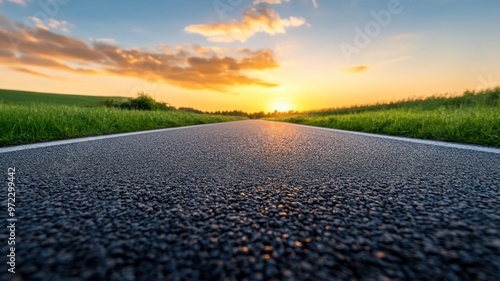 Fototapeta premium a winding road under a vibrant sunset, surrounded by lush greenery and...