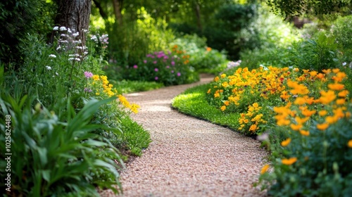 Obraz premium A winding stone pathway leads through a lush garden with vibrant blooming...