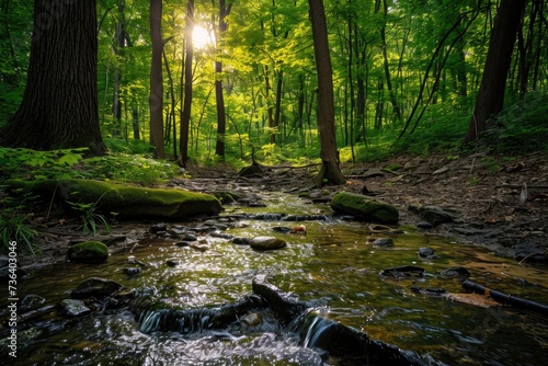 © Iftikhar alam, Obraz premium A winding stream cuts through a dense forest, surrounded by vibrant foliage and towering trees, An enchanted forest with a sparkling brook, AI Generated