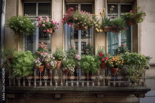 Fototapeta premium a window garden with blooming flowers and herbs on a balcony in the city, created with generative ai