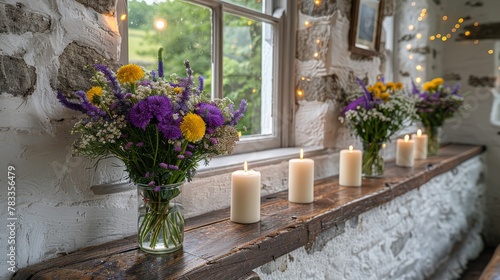 © Anna, Naklejka premium A window sill adorned with a floral arrangement in a vase and lit candles before it