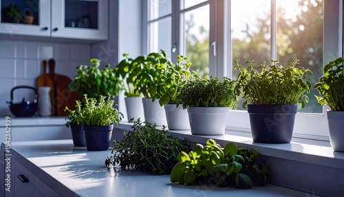 © Ana, Obraz premium A window sill with several potted plants, including basil, parsley, and mint. The plants are arranged in various sizes and heights, creating a lush and vibrant display