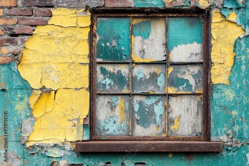Naklejka premium A window with a green frame and yellow paint peeling off the wall, generative...