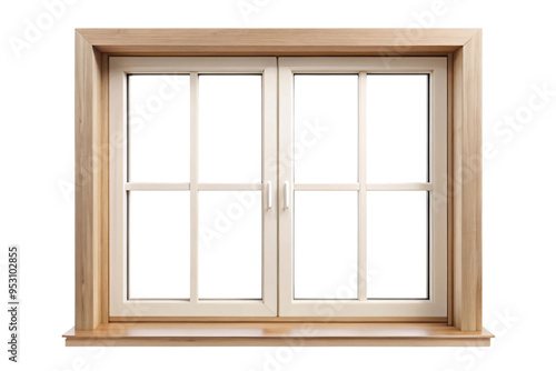 © Tanicsean, Obraz premium A window with a light wood frame and white grid panels on a transparent background, perfect for homes aiming for a blend of rustic and modern design elements