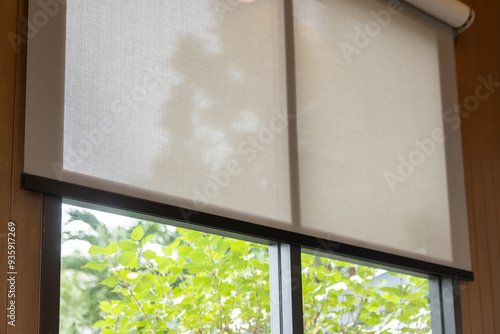 © Rattanachat, Naklejka premium A window with a white blind and a tree outside