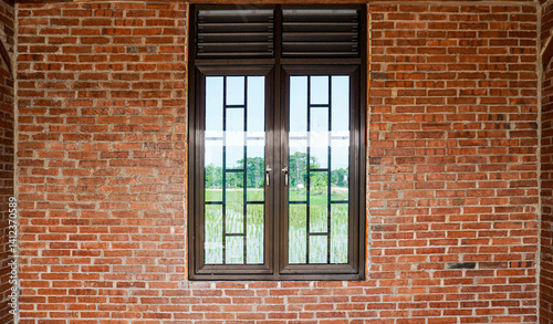 © Rakabits, Fototapeta premium A window with metal bars set against a brick wall, offering a glimpse of the outside landscape through the glass. The image captures a rustic architectural feature.