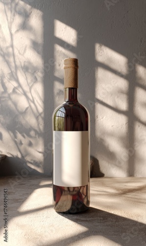 © Surachetsh, Fototapeta premium A wine bottle mockup with a clean white label is styled with minimalist plant decor, offering a modern look for branding design.