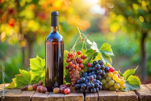 Fototapeta premium A wine bottle with a bouquet of grapes and leaves surrounding it in a garden...
