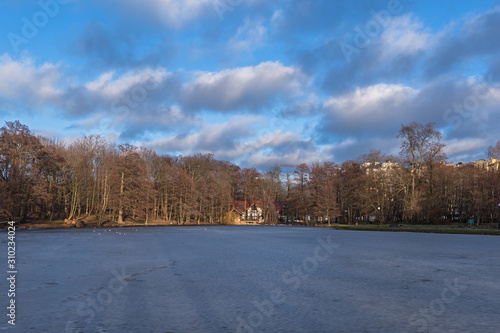 © Eselena, Fototapeta premium A winter city landscape. A frozen pond in an empty park at the end of the day. White House. Birds on the ice.