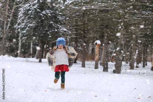 Naklejka premium A winter fairy tale in the forest. A girl on a sled with gifts on the eve of the new year in the park. Two sisters walk in a New Year's park and ride a sled with gifts.